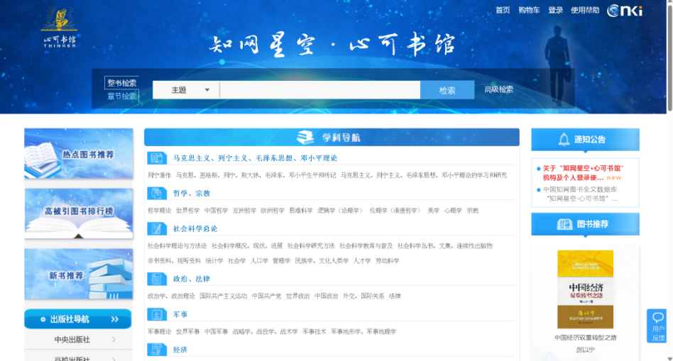《中国图书全文数据库(心可书馆)》是以中国知网海内外2亿专业读者为服务对象,基于中国知网海量数字资源,运用知识关联、大数据分析等技术,集图书检索、专业化推荐、在线研学、在线订阅功能于一体的图书服务平台。通过参考文献、引证文献等关联关系,实现了图书内容与其他各类文献资源的深度关联融合,为读者提供专业化的知识库和个性化的知识服务。